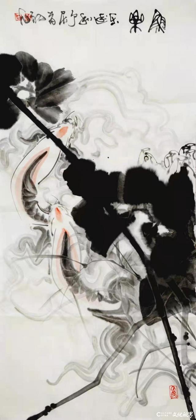 赵初凡随即打开册页,为走进文化视界的画家作品集再添精品。一样是浓墨起笔,枝桠在水中伸展、鱼儿在水中游弋、波光在四周渲染……不一样的是册页上的作品以写意为主,把赵初凡以层次感见长的特点充分体现了出来,似比《鱼乐》色彩单一,却更有无尽意境蕴藏其中。